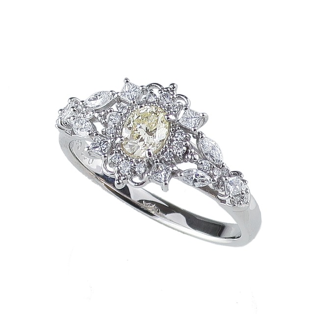 ライトイエローのダイヤモンドをセンターに留めて、プリンセスカットやマーキースカットのダイヤでアンティーク風にアレンジしたリングです。 上品さと華やかさを感じさせるデザインで手元を美しく演出してくれます。 PT900 ライトイエローダイヤモンド0.25ctUP(センター石)/脇石0.35ct (天然石ですので色合いに個体差があります。ご了承ください。) ご購入いただいてからの受注生産になります。(約3週間) made in japan 製品縦幅 1.0cm 製品厚み 0.3cm 製品総重量 3.6g