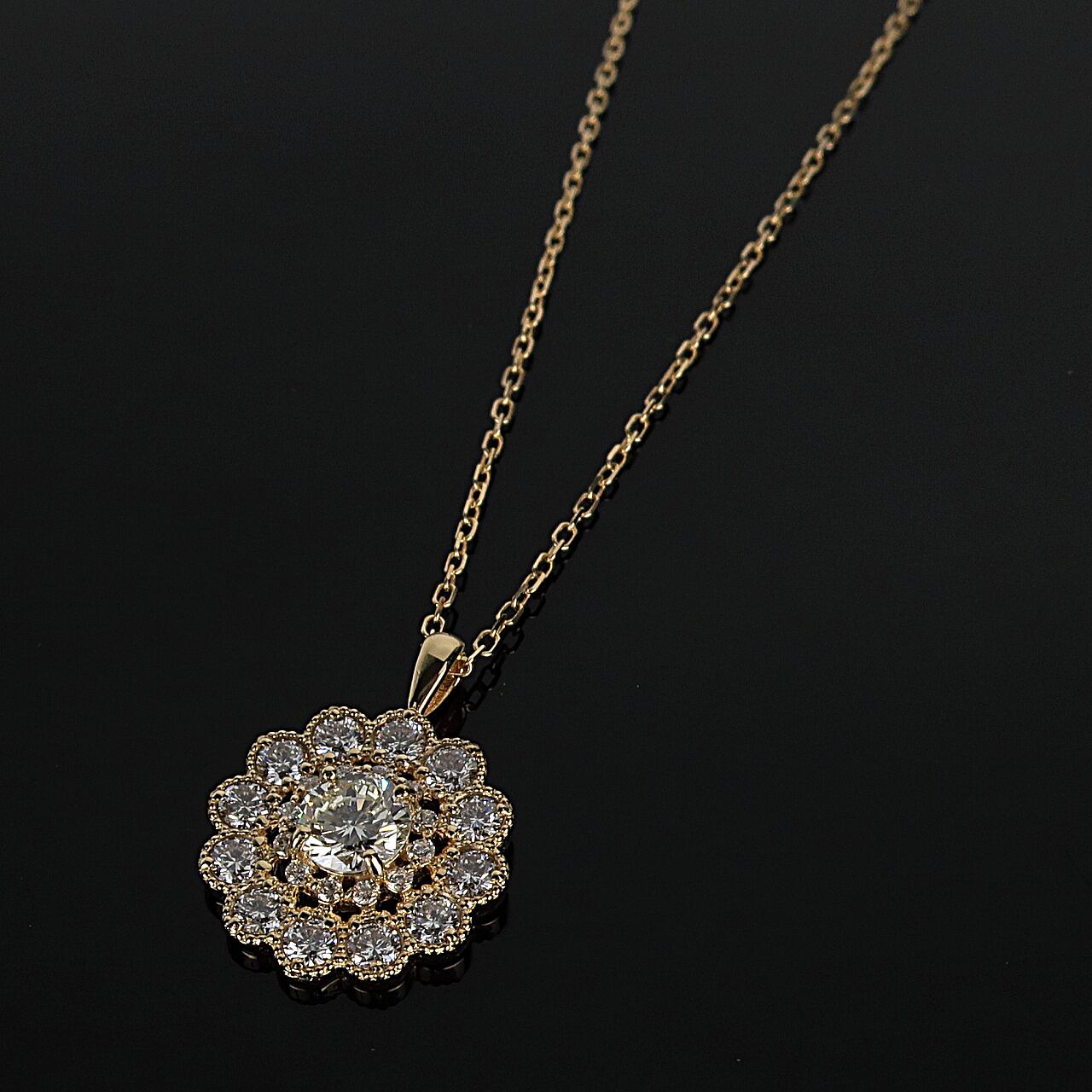 センターに0.3ctダイヤを配し、メレダイヤでアンティーク風に取り巻いたペンダントです。