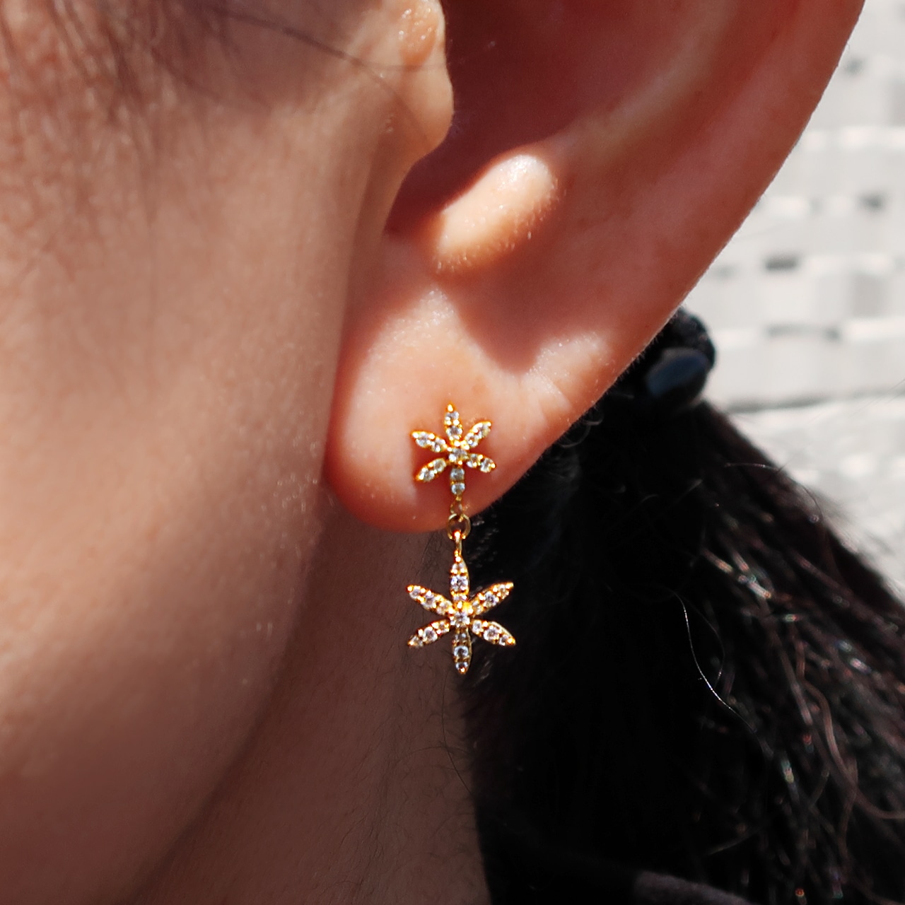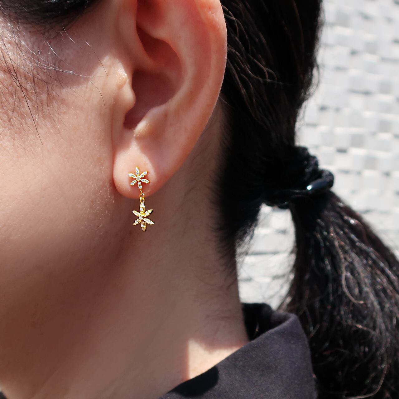 かわいい花のモチーフを揺れるタイプのピアスにしました。