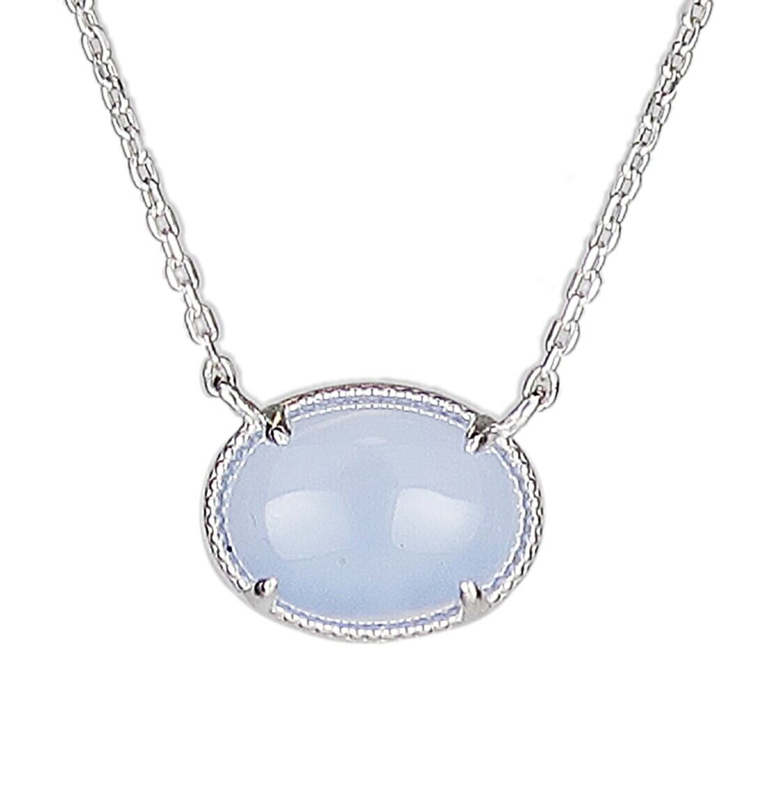 宝石の中では珍しい色合い、淡い青色のブルーカルセドニーをミルグレーンで取り巻いたかわいいペンダントに仕上げました。