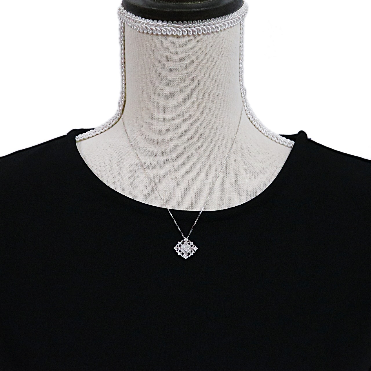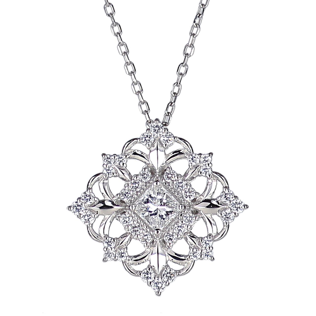 センターにプリンセスカットのダイヤモンドを配し、ゴシック風のデザインで華やかさを表現したペンダントになります。