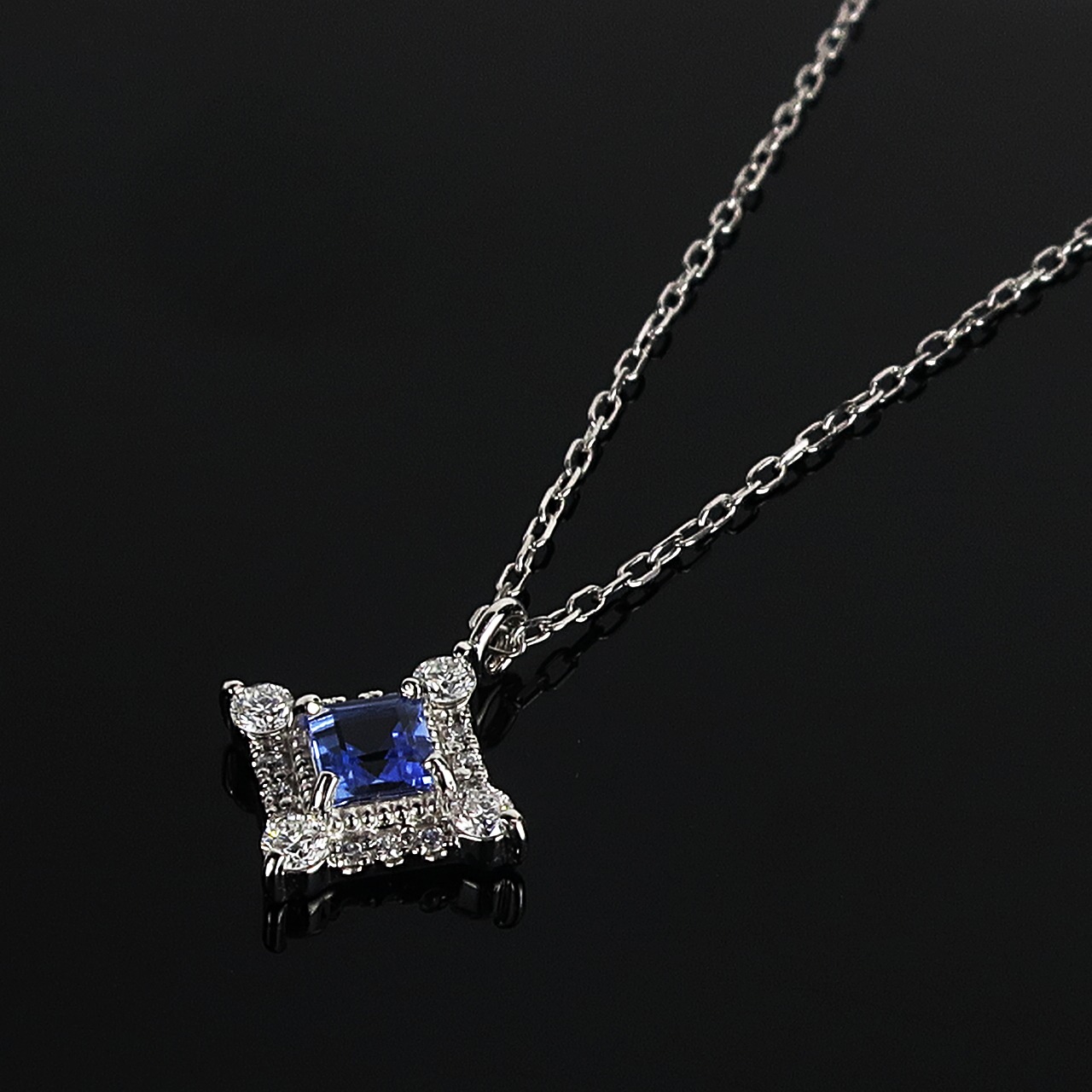深い色合いのタンザナイトをセンターに、周りをミルグレーンとダイヤモンドで取り巻いたペンダントです。