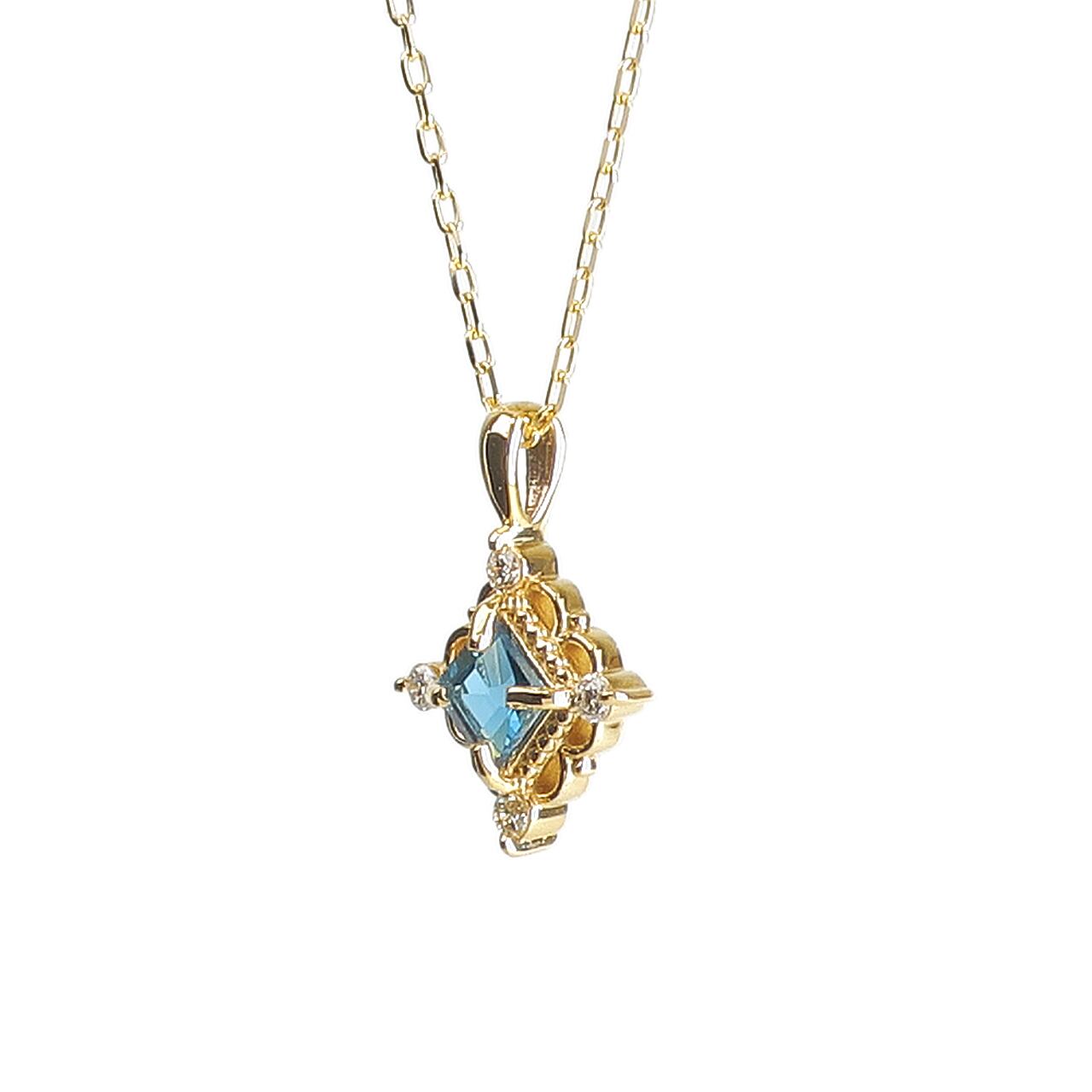 スクエアーカットの、深い独特の色合いを持つロンドンブルートパーズをアンティーク風の枠に留めたかわいいペンダントです。