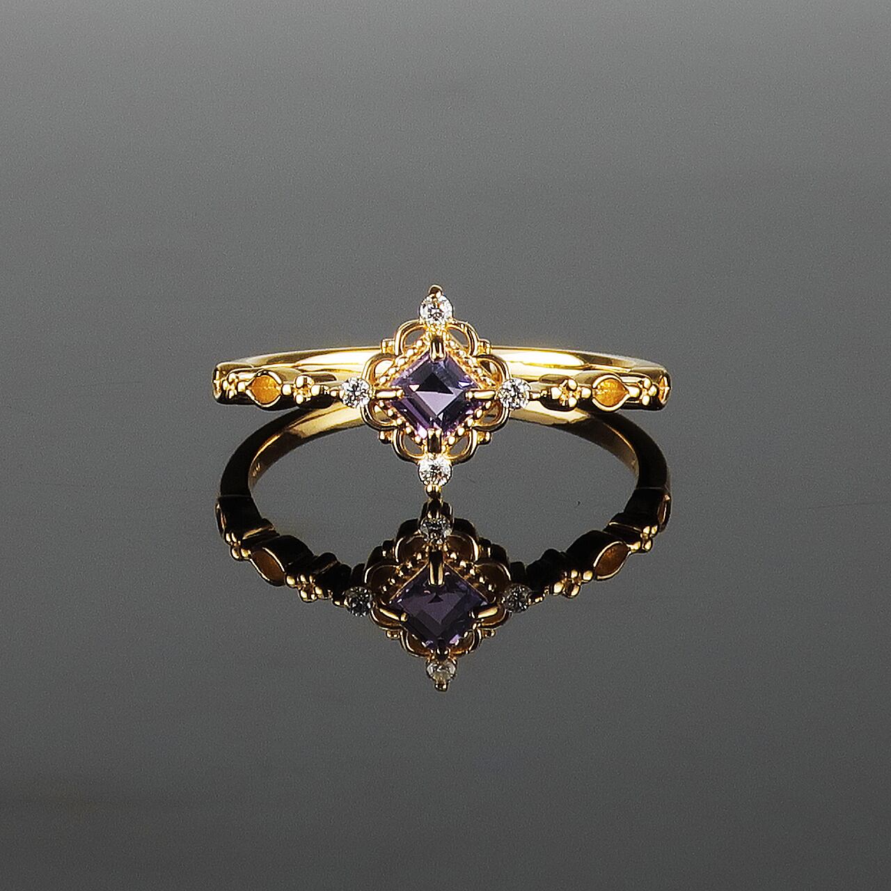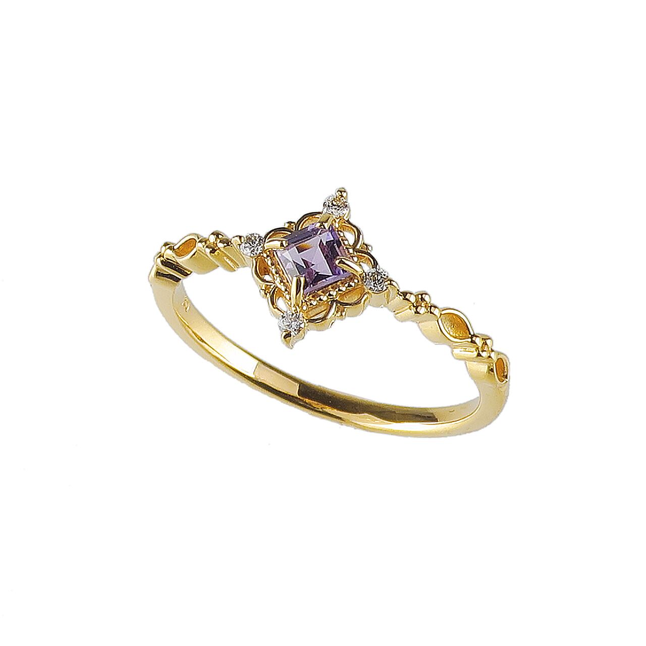 K18ライトアメジスト/ダイヤモンド0.03ctリング RI-53YGNWLAM。 アンティーク風の枠にスクエアーカットのライトアメジストを留めたかわいいリングです。周りにはダイヤモンドも配置し、華やかさを演出しました。アメジストは2月の誕生石。また、明るい色合いのアメジストはとてもやさしい印象です。