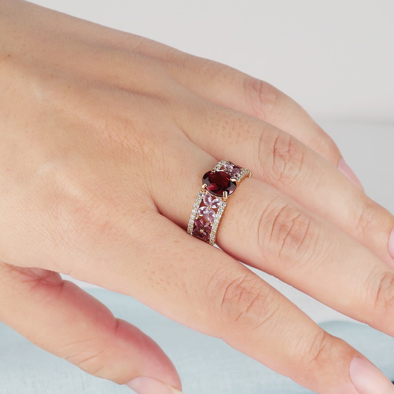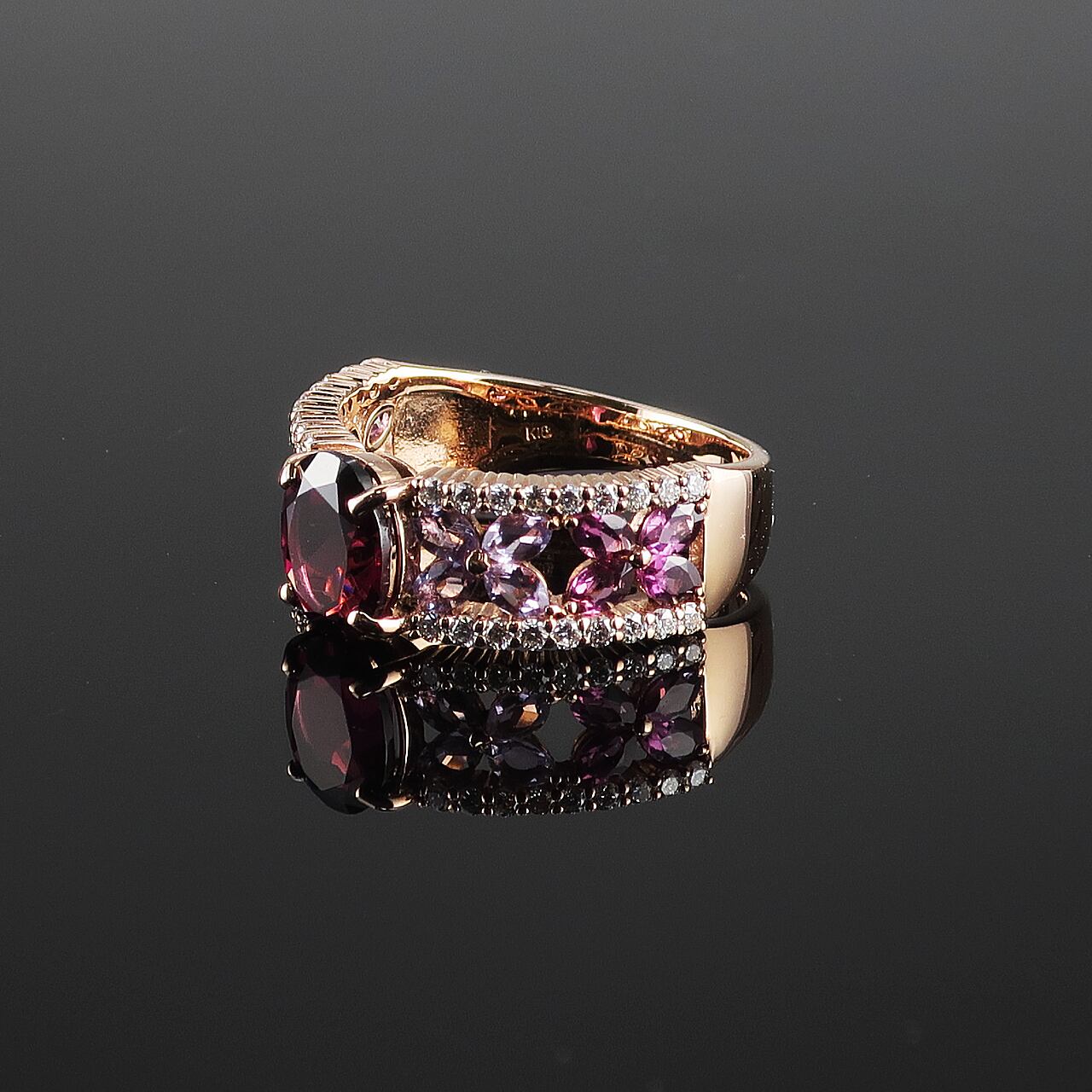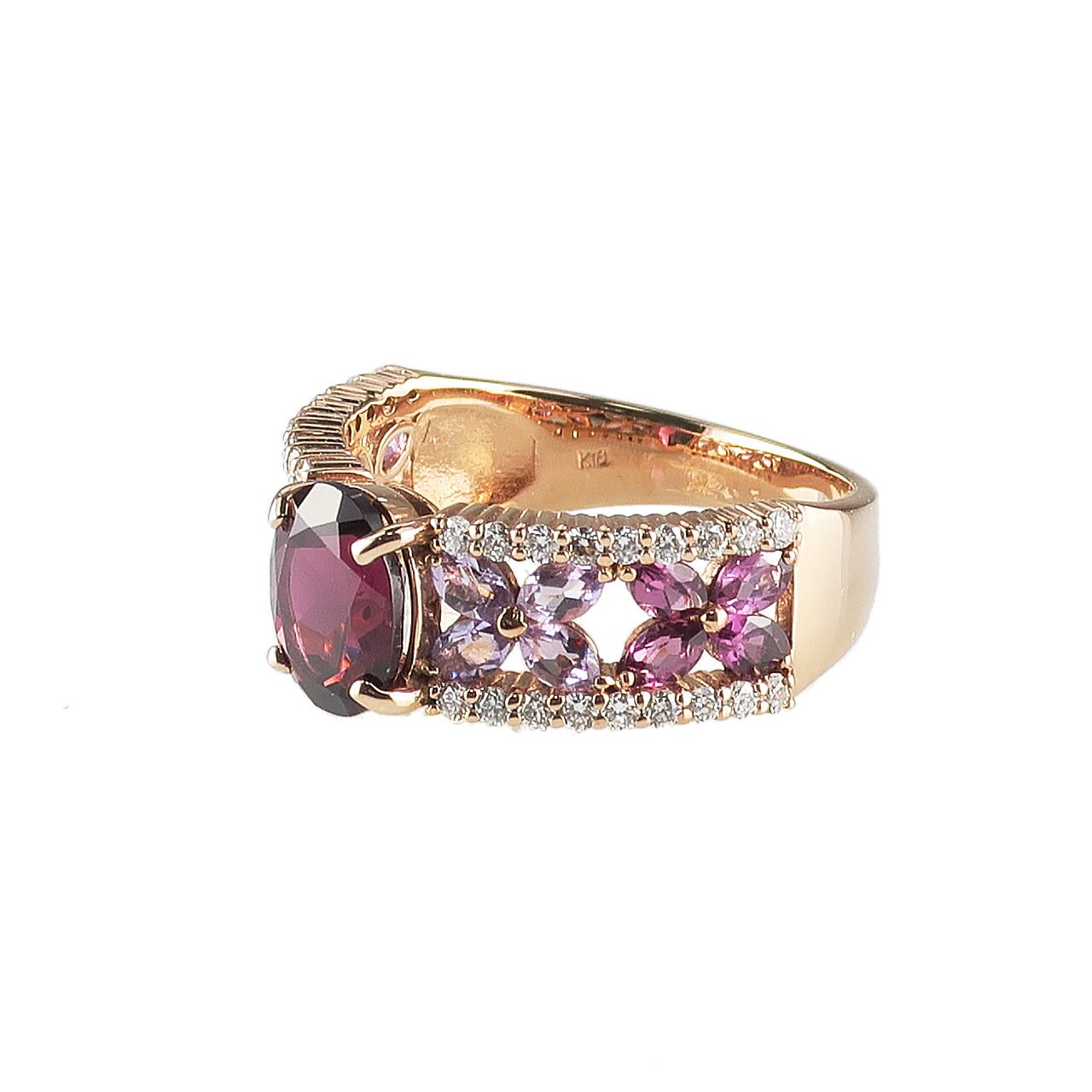 きらめき感のある、きれいなロードライトガーネットの脇に、花のようにライトアメジストとロードライトガーネットを配置し、上下にダイヤを留めた華やかなリングです。 色のコントラストが美しい上品なリング。