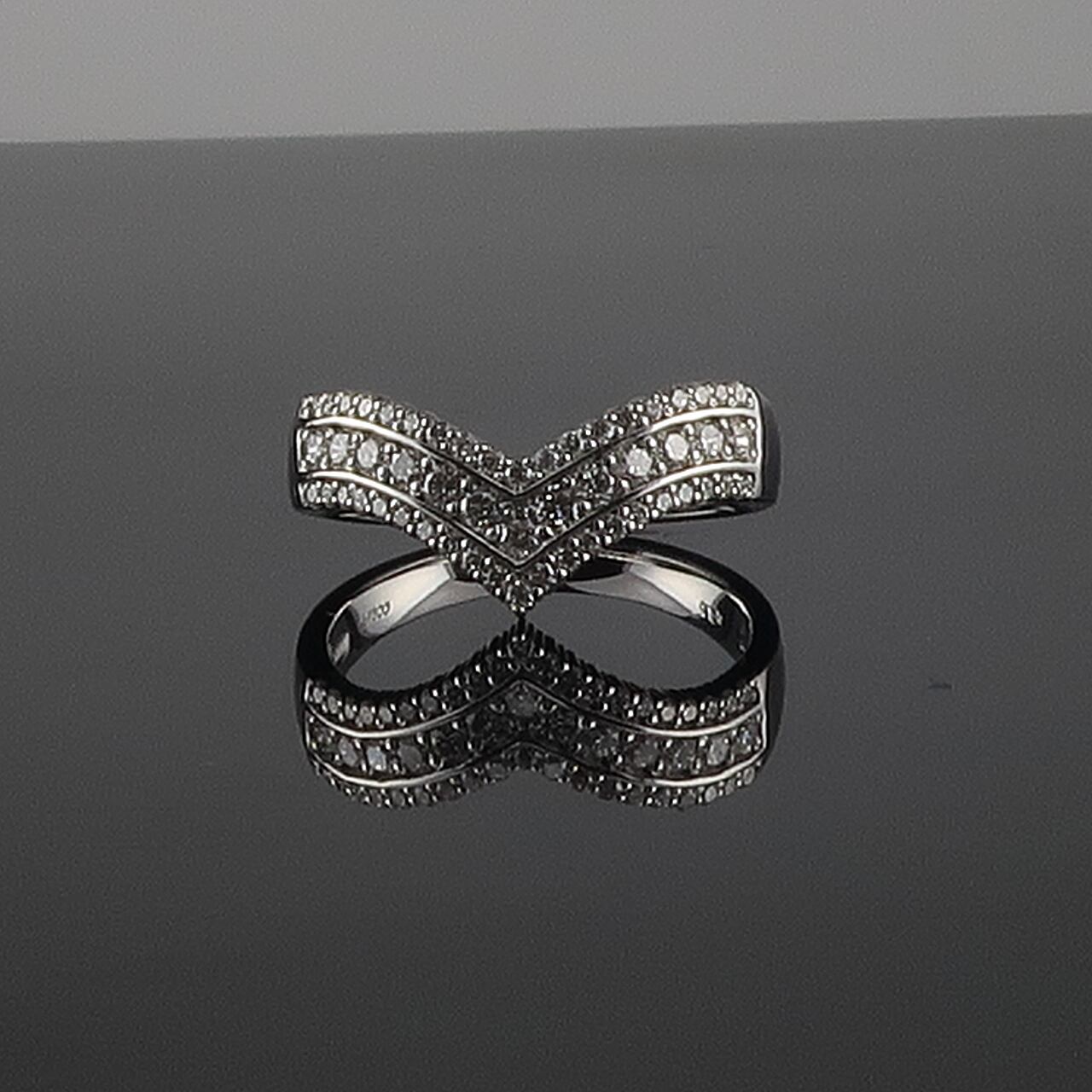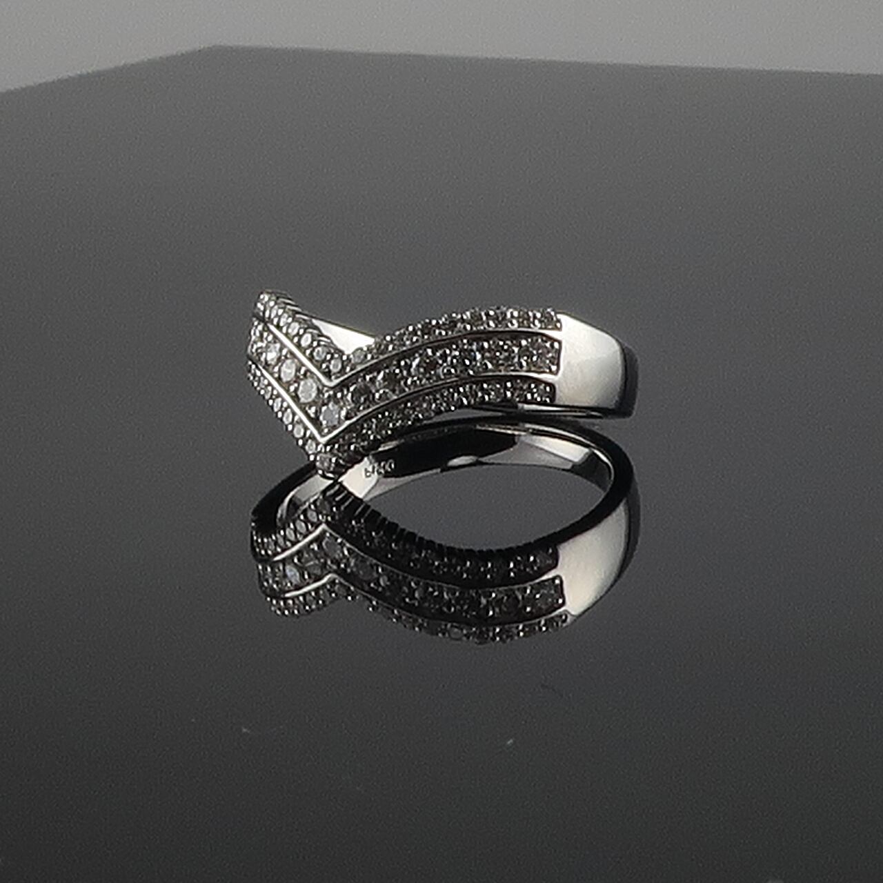 プラチナ ダイヤモンドV字リング。ダイヤモンドパヴェの中に地金のラインがシャープさを演出してくれています。