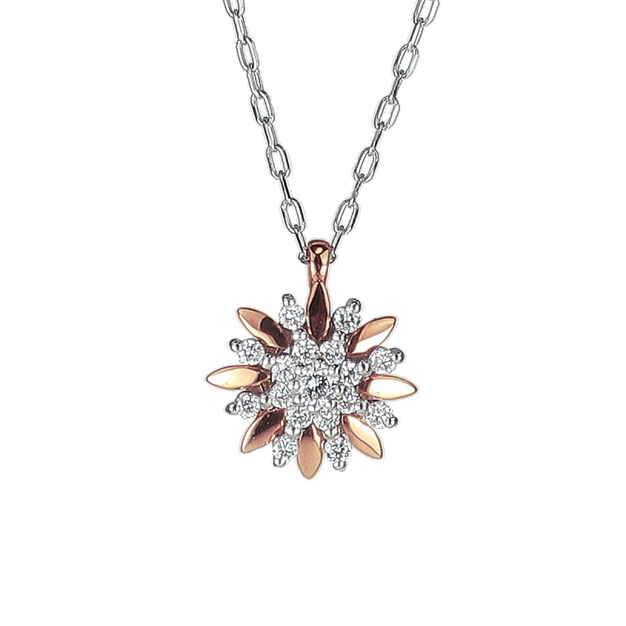 プラチナとピンクゴールドのコンビにダイヤモンドをあしらった華やかで,かわいいペンダントです。