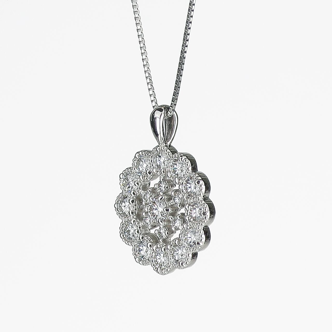 ダイヤモンドの周りにミルグレーンの繊細なデザインをあしらったサークルペンダント。
