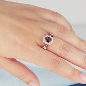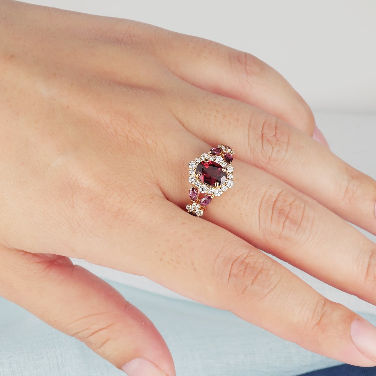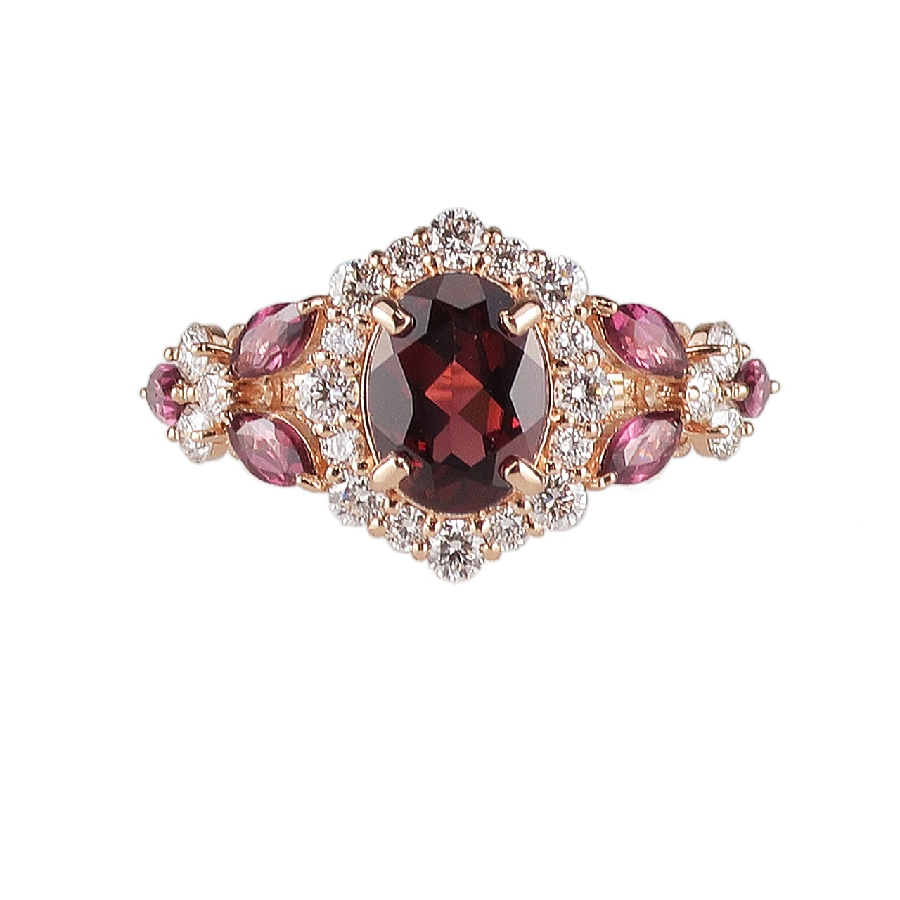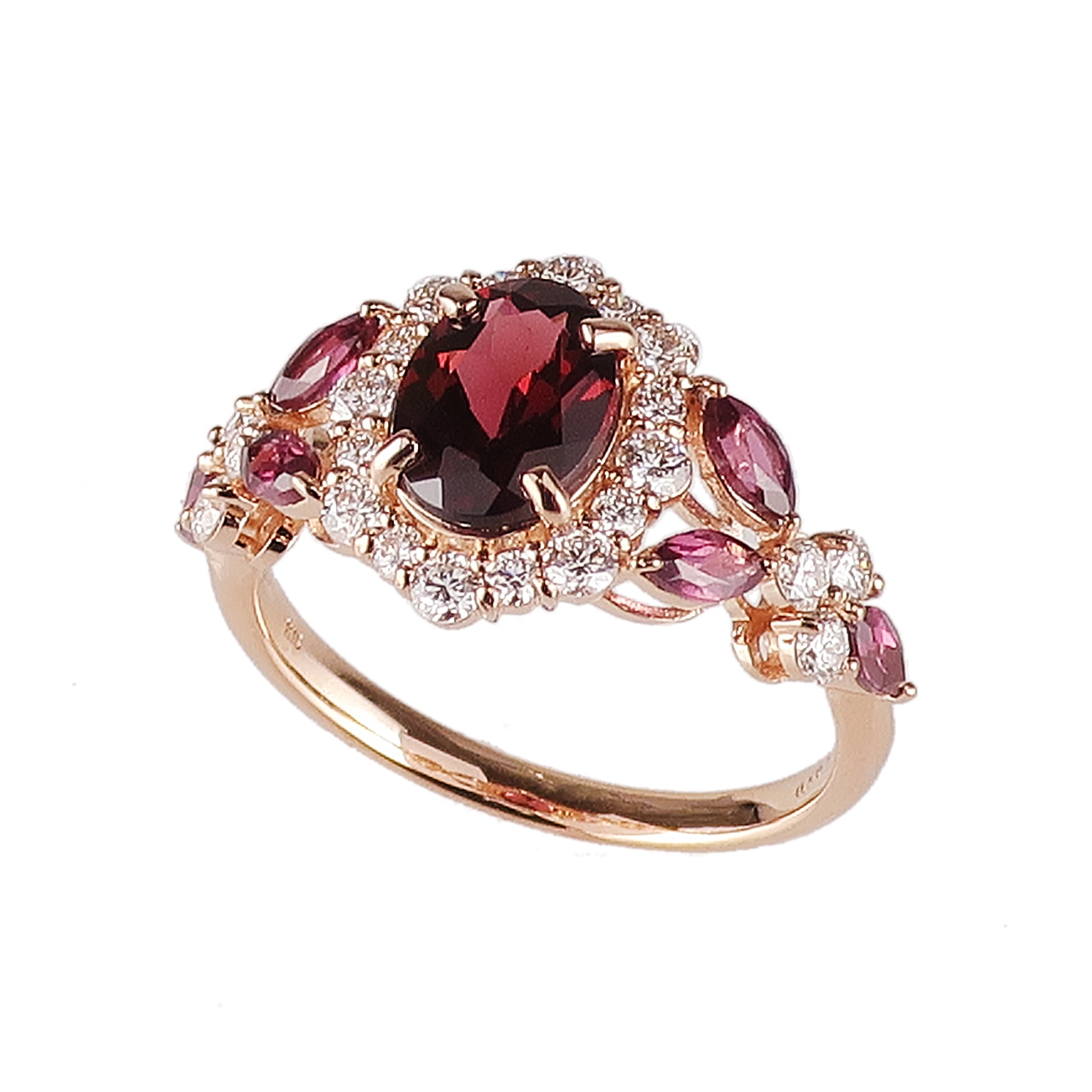 K18ピンクゴールド ロードライトガーネット/ダイヤモンド0.5ctリング RI-31PGNWRG。 深い色合いのロードライトガーネット(1.0ctUP)をダイヤモンドで取り巻き、腕にもロードライトガーネットを留め、落ち着いた雰囲気に仕上げました。