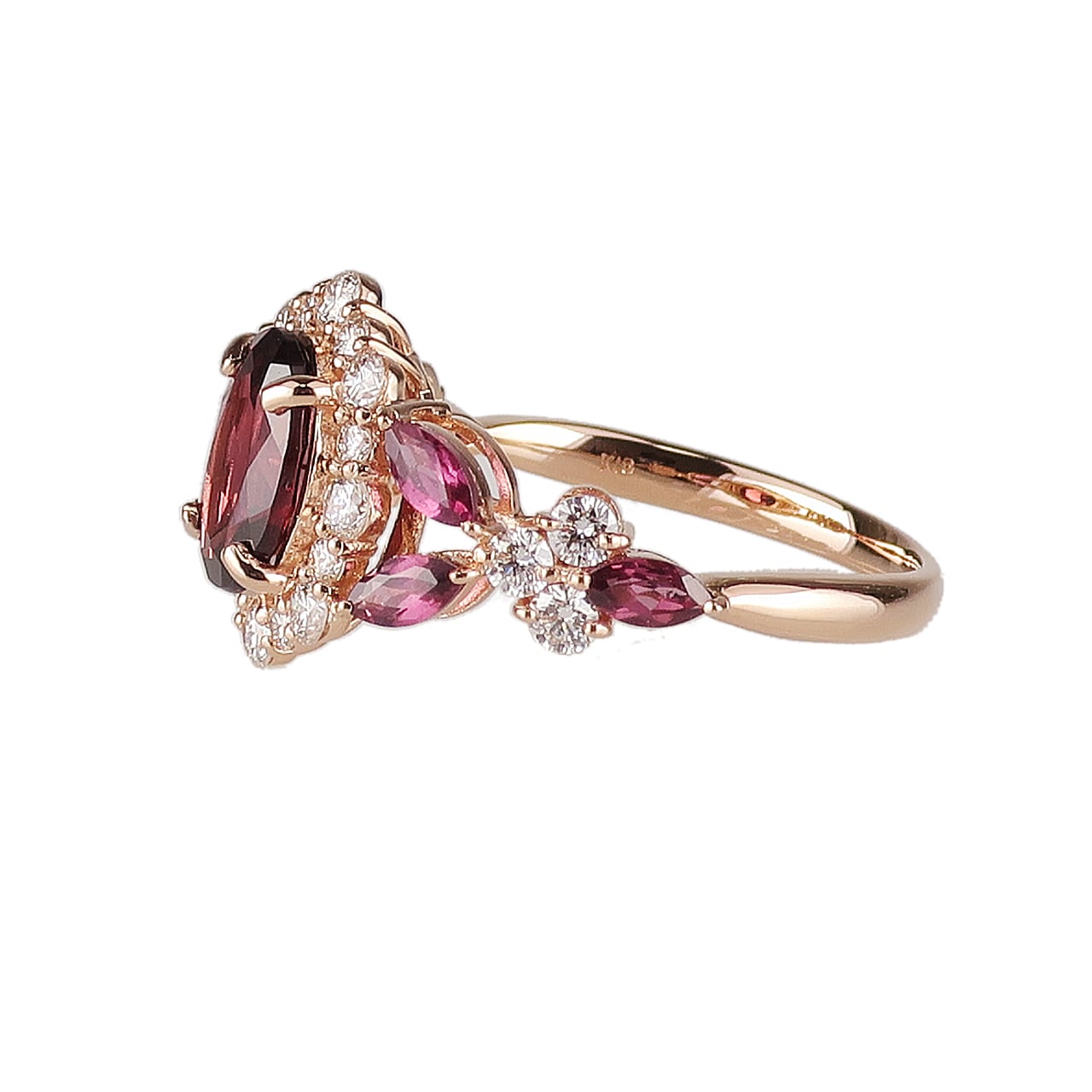 K18ピンクゴールド ロードライトガーネット/ダイヤモンド0.5ctリング RI-31PGNWRG。 深い色合いのロードライトガーネット(1.0ctUP)をダイヤモンドで取り巻き、腕にもロードライトガーネットを留め、落ち着いた雰囲気に仕上げました。