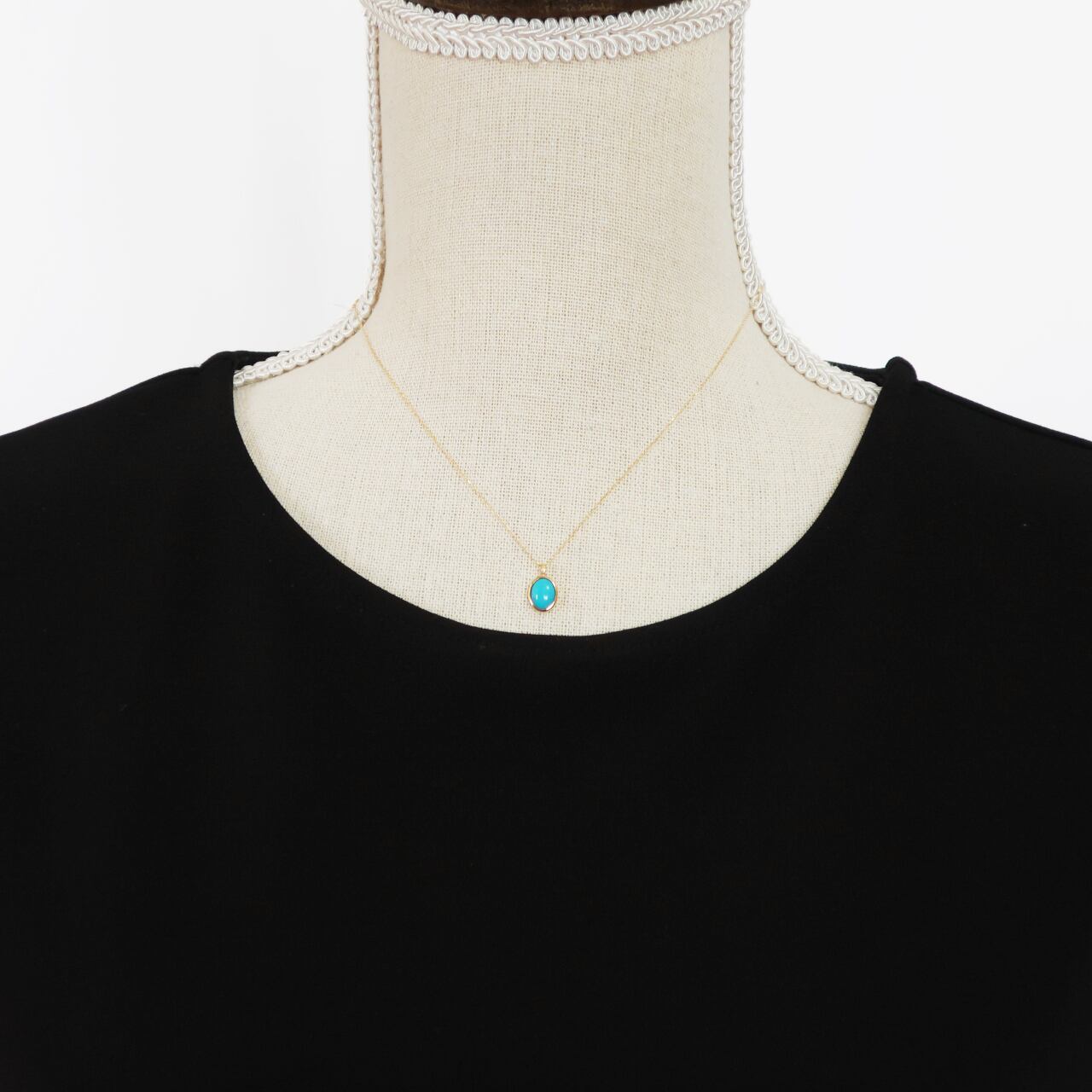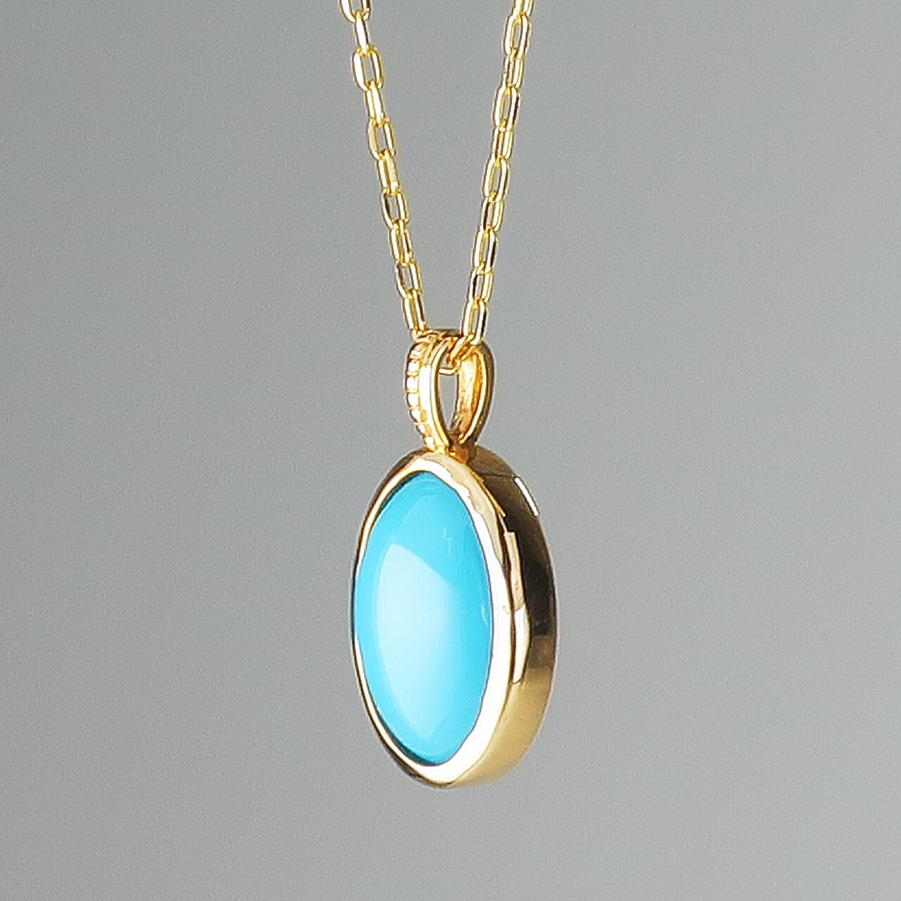 カボションカットのターコイズ(トルコ石)をシンプルな枠に留めたかわいいペンダントです。どんな装いにも合わせやすく、普段使いにお勧めです。