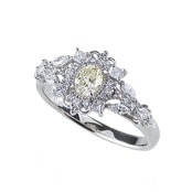ライトイエローのダイヤモンドをセンターに留めて、プリンセスカットやマーキースカットのダイヤでアンティーク風にアレンジしたリングです。