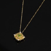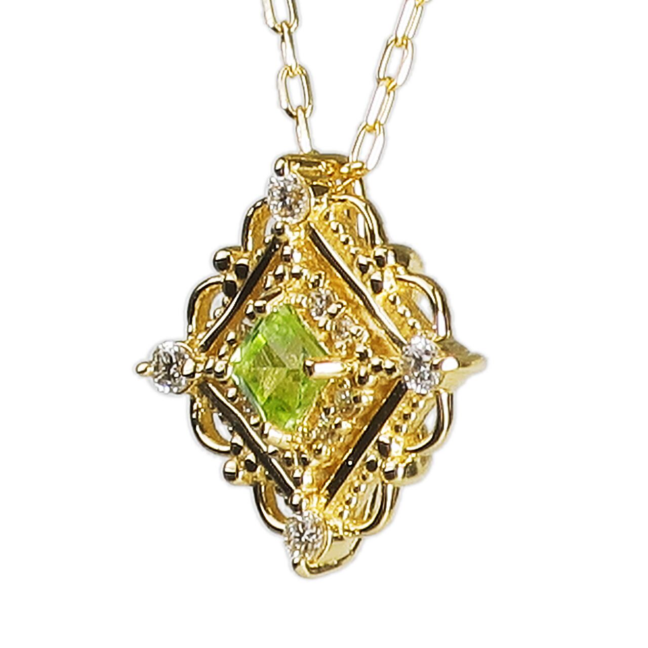 センターにプリンセスカットのペリドットを配し、アンティーク風のデザインに仕上げたペンダントです。
